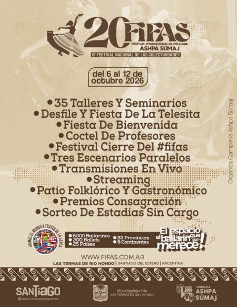 El FIFAS 2026 contará con la adhesión del Gobierno de la Provincia de Santiago del Estero y de la Municipalidad de Las Termas de Río Hondo, ratificando el acompañamiento institucional a un evento que no solo tiene impacto cultural, sino también turístico y económico. Bajo la consigna “Unimos el mundo a través de la danza”, el festival vuelve a proyectar a Las Termas de Río Hondo como epicentro del folklore mundial y confirma, con esta temprana definición, que la excelencia también se construye desde la planificación.