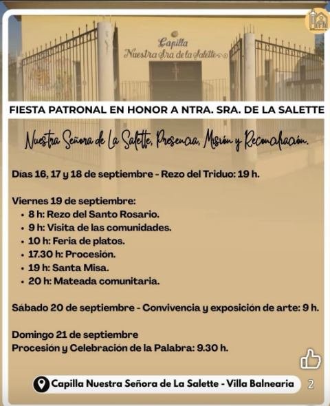 La comunidad de la Capilla Nuestra Señora de La Salette vive días de profunda fe y encuentro en el marco de su tradicional Fiesta Patronal, que este año se desarrolla del 16 al 21 de septiembre con un variado programa de actividades religiosas y culturales.